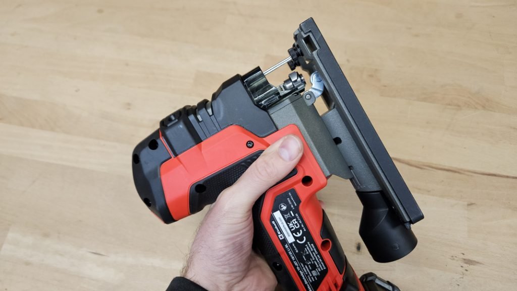 Côté fonctionnalités, on retrouve l’essentiel : un réglage du mouvement pendulaire avec quatre positions et un changement de lame rapide par levier, sans outil. Le réglage de la semelle pour les coupes en biais nécessite en revanche l’utilisation de la clé Allen fournie, avec des préréglages aux angles principaux. Un adaptateur pour aspirateur est également inclus.