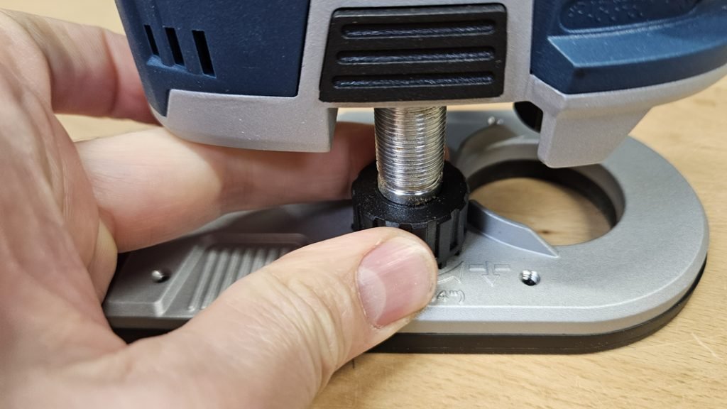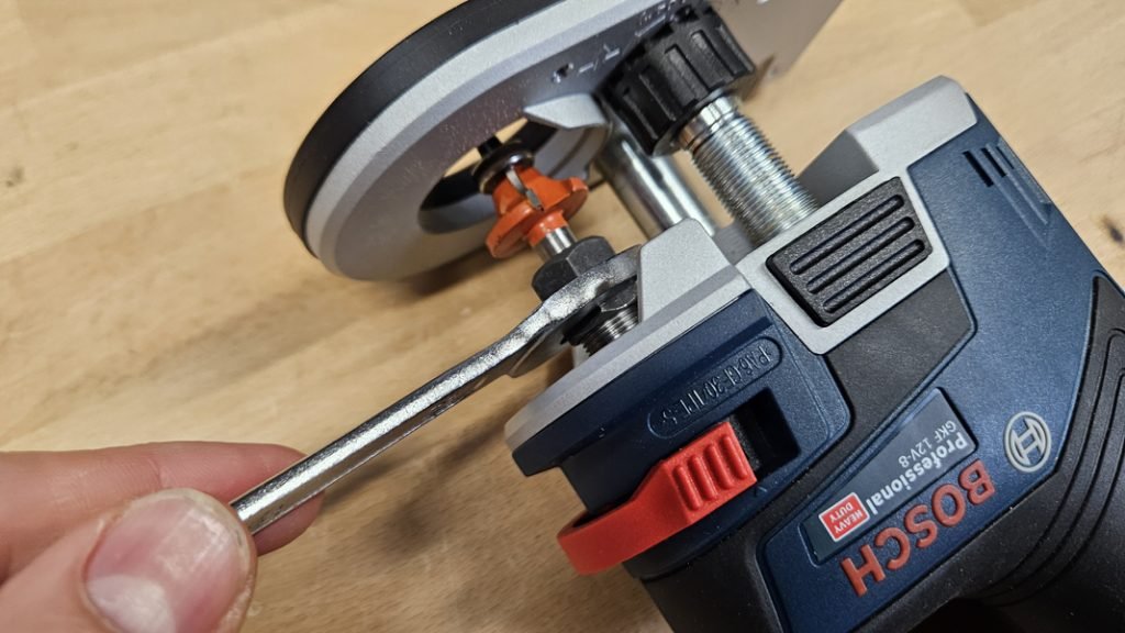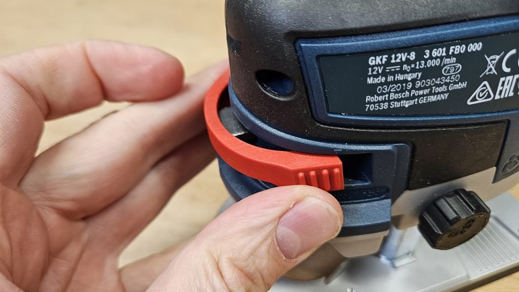 Le changement de fraise est aussi très simple grâce au système de blocage d’arbre intégré. D’ailleurs, pour information, la machine accepte des fraises de 6 mm et 8 mm, selon la bague montée.