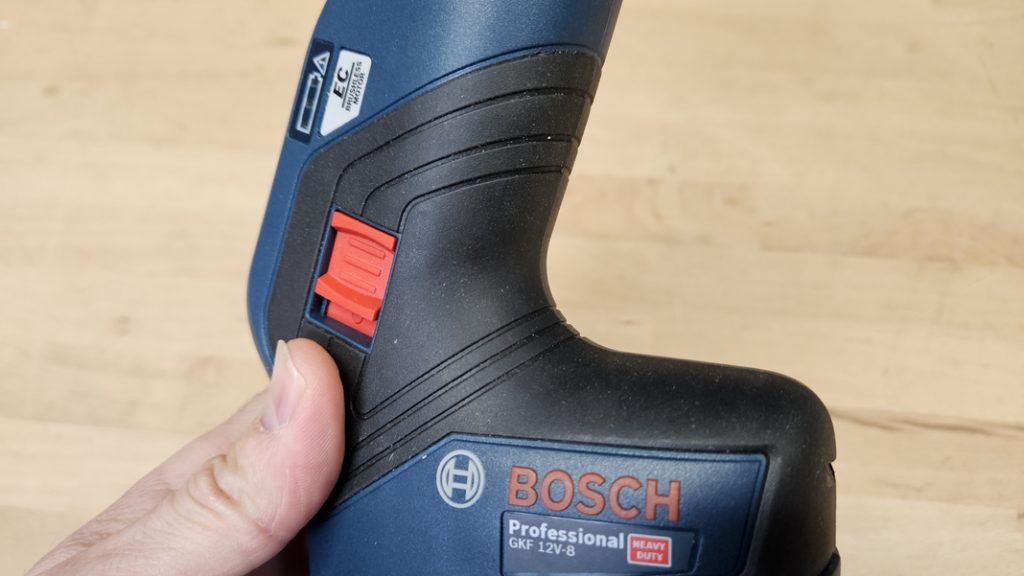 L’un des points forts de la Bosch GKF 12V-8 est sa prise en main verticale avec grip ergonomique. Le bouton de démarrage tombe naturellement sous le pouce. La machine se contrôle facilement à une main et offre une bonne visibilité sur la zone de travail.