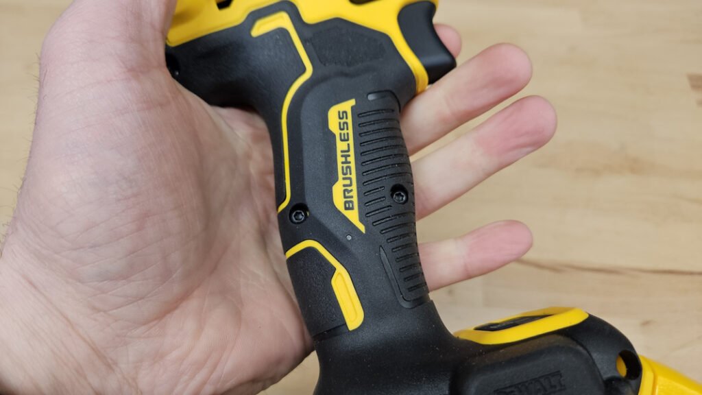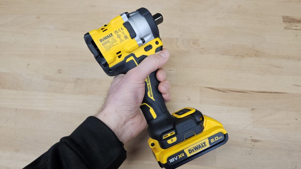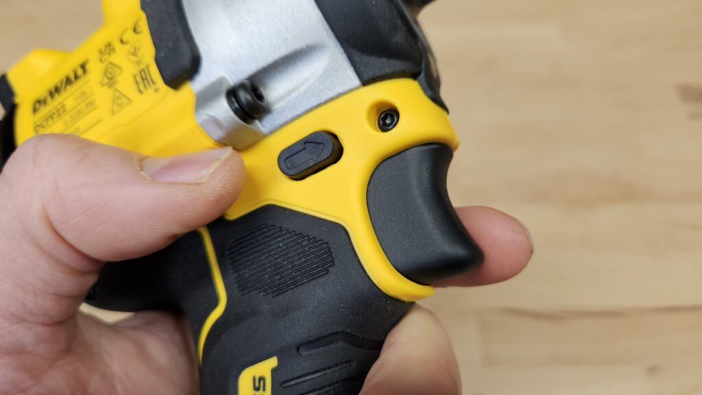 Avec 1,13 kg sans batterie, la DCF922N reste dans une plage de poids raisonnable pour une boulonneuse, surtout au regard des performances annoncées. Son point fort majeur est sa longueur de seulement 12,5 cm, une taille particulièrement petite qui facilite l’intervention dans des endroits difficiles d’accès, par exemple entre des éléments de structure, sous un châssis, ou dans des zones encombrées d’un atelier. La poignée est intégralement recouverte d’un grip, ce qui améliore l’adhérence et le confort, notamment lorsque l’on travaille avec des gants. Les commandes tombent naturellement sous les doigts, la gâchette est bien positionnée, l’inverseur de sens est accessible, avec une position centrale de blocage, utile pour le transport et la sécurité.