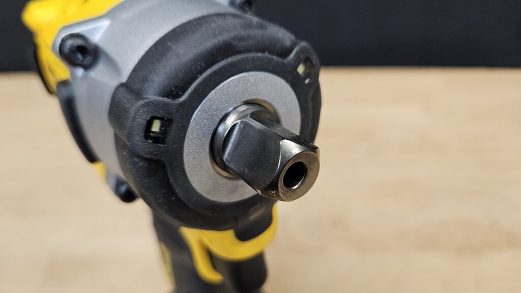 Le porte douille est au format 1/2, un standard qui garantit une compatibilité directe avec les douilles courantes. Autour du porte douille, trois LED sont intégrées, avec deux niveaux de luminosité. Cette configuration apporte une vraie valeur ajoutée sur chantier, notamment dans les zones sombres, sous un véhicule ou dans une pièce technique peu éclairée. Les LED positionnées autour de l’axe réduisent les ombres portées, ce qui améliore la visibilité par rapport à une simple LED en bas de poignée. Le bouton dédié à l’éclairage, en plus de l’activation à la gâchette, permet aussi d’éclairer la zone sans faire tourner l’outil, ce qui reste pratique pour préparer une intervention.