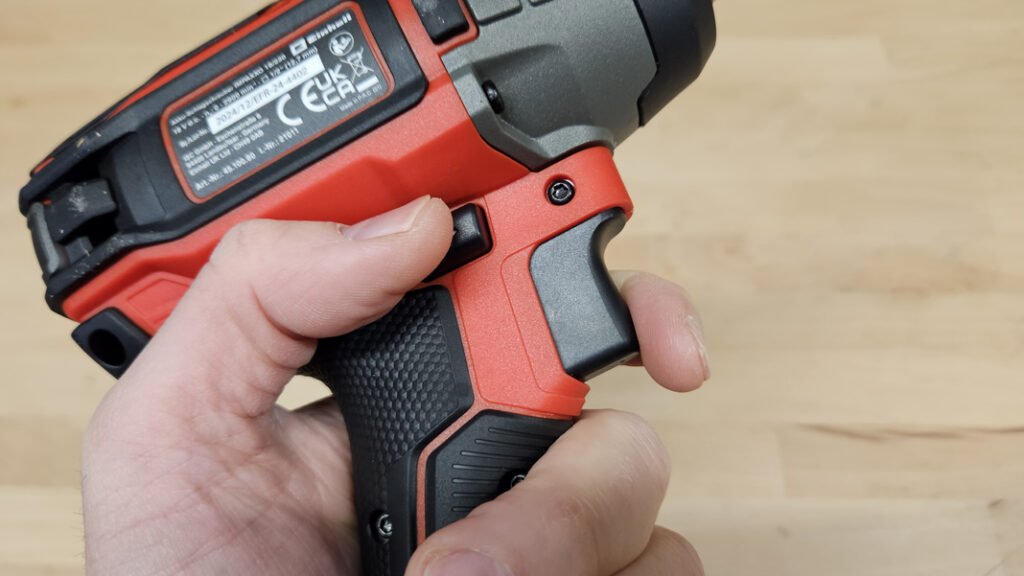 Les commandes sont simples et tombent bien sous les doigts : une large gâchette de mise en marche permet de doser la vitesse, tandis que l’inverseur de rotation (serrage / desserrage) est accessible au pouce ou à l’index sans lâcher la poignée. Le moteur réagit bien aux variations de pression sur la gâchette, ce qui aide à démarrer un serrage en douceur avant de laisser la boulonneuse prendre de la vitesse.