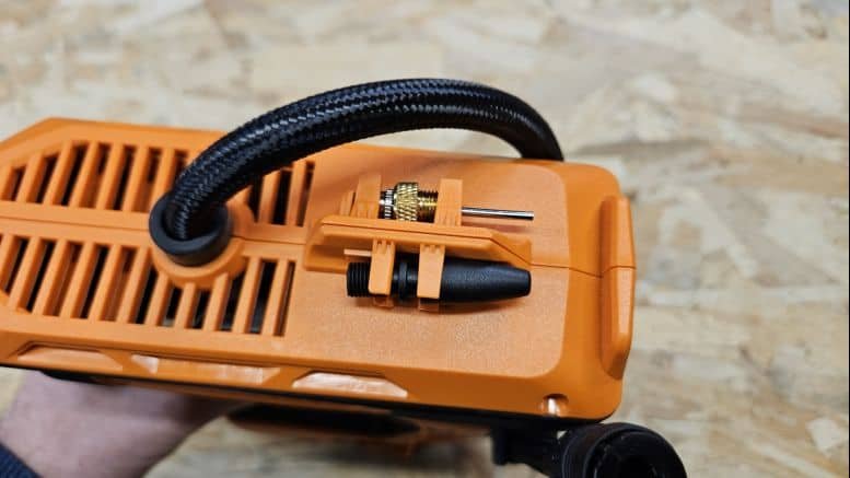 Les embouts fournis permettent de s’adapter à différents usages (sport, vélo, auto). Le flexible à raccord rapide est facile à utiliser, et sa fixation solide sur l’appareil est rassurante pendant le transport.