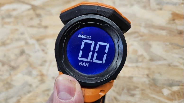 Le système de réglage de la pression fonctionne via une molette rotative, très simple à utiliser. Il permet de choisir précisément la pression souhaitée. L’écran digital rétroéclairé est lisible même à distance et affiche en temps réel la pression mesurée. Lorsque le mode automatique est activé, le compresseur s’arrête de lui-même une fois la pression atteinte.