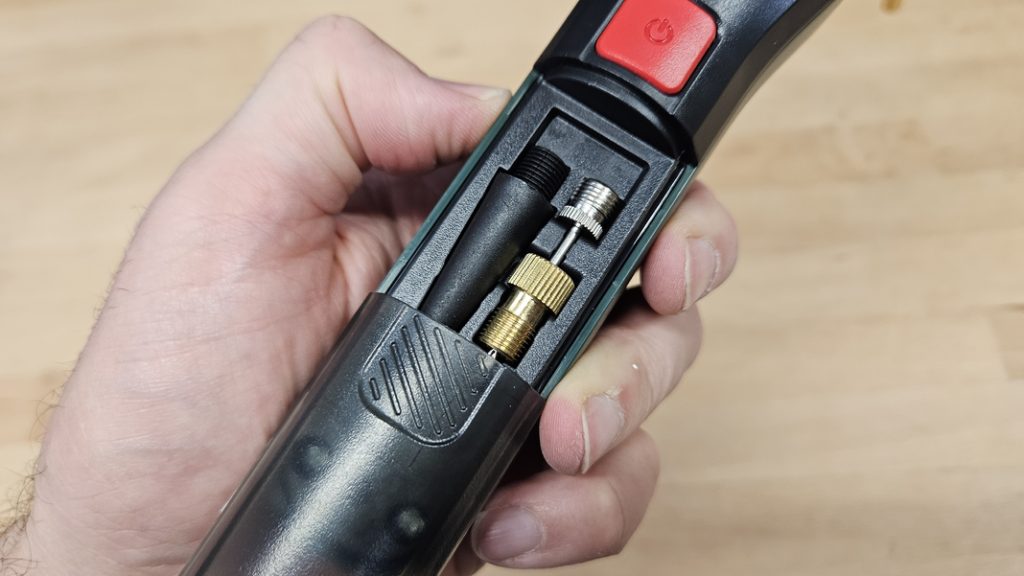 Trois adaptateurs sont fournis : aiguille pour ballons, buse pour soufflette et adaptateur pour valve Presta (vélos). Tous se rangent directement dans la poignée de l’appareil. Ce système évite tout accessoire perdu en déplacement.