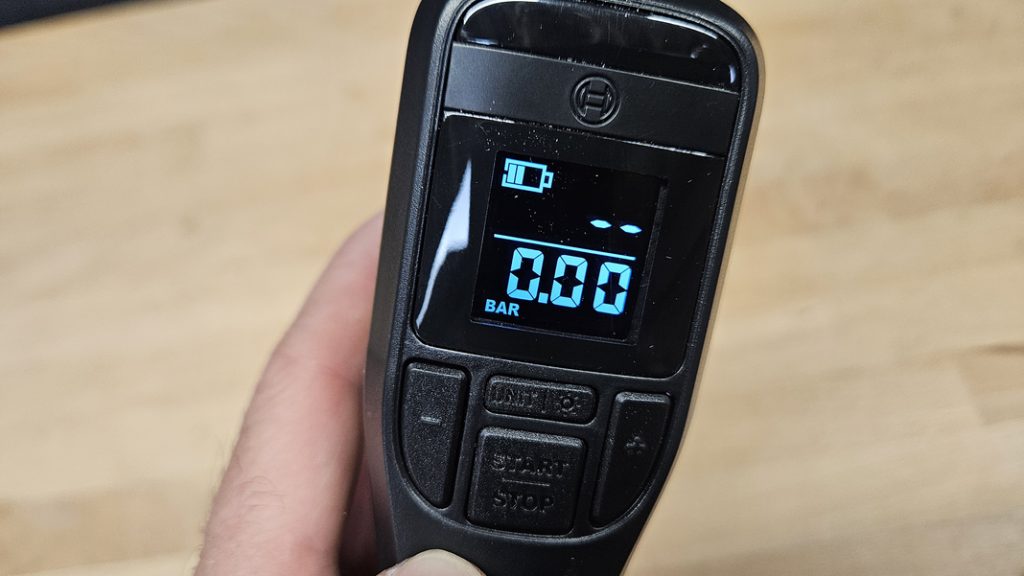 L’EasyPump propose un mode automatique : il suffit de définir la pression cible à l’aide des boutons (+/-) et l’appareil s’arrête une fois la pression atteinte. Plusieurs unités de mesure sont disponibles (bar, psi…), et une LED éclaire la zone de travail. L’allumage et le déclenchement du compresseur se font via des boutons distincts, bien visibles et simples à utiliser.