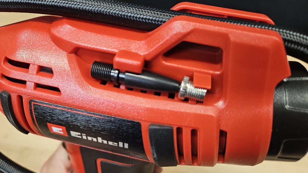 Le flexible de 60 cm est intégré au compresseur, ce qui permet une bonne maniabilité même lorsqu’il est posé au sol. Côté accessoires, Einhell fournit :
