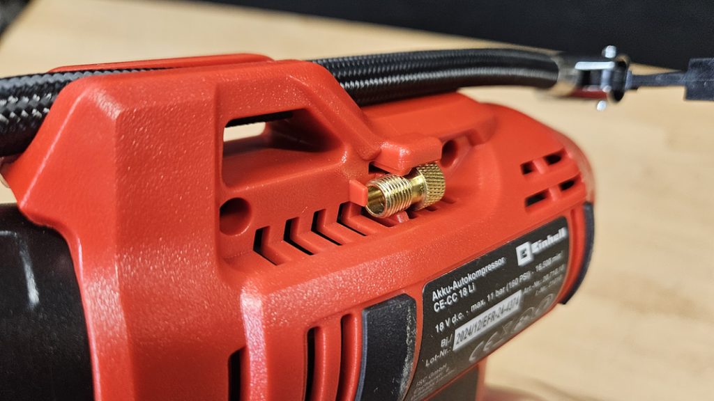 Avec un poids de seulement 766 g (sans batterie), le compresseur Einhell CE-CC 18 Li est extrêmement compact et léger. Il se transporte facilement dans un coffre de voiture ou même dans un sac à dos pour les déplacements à vélo. La poignée est bien dimensionnée et recouverte d’un grip agréable. Tous les accessoires, y compris le flexible et les embouts, se rangent directement sur l’appareil, ce qui évite toute perte et renforce la praticité.