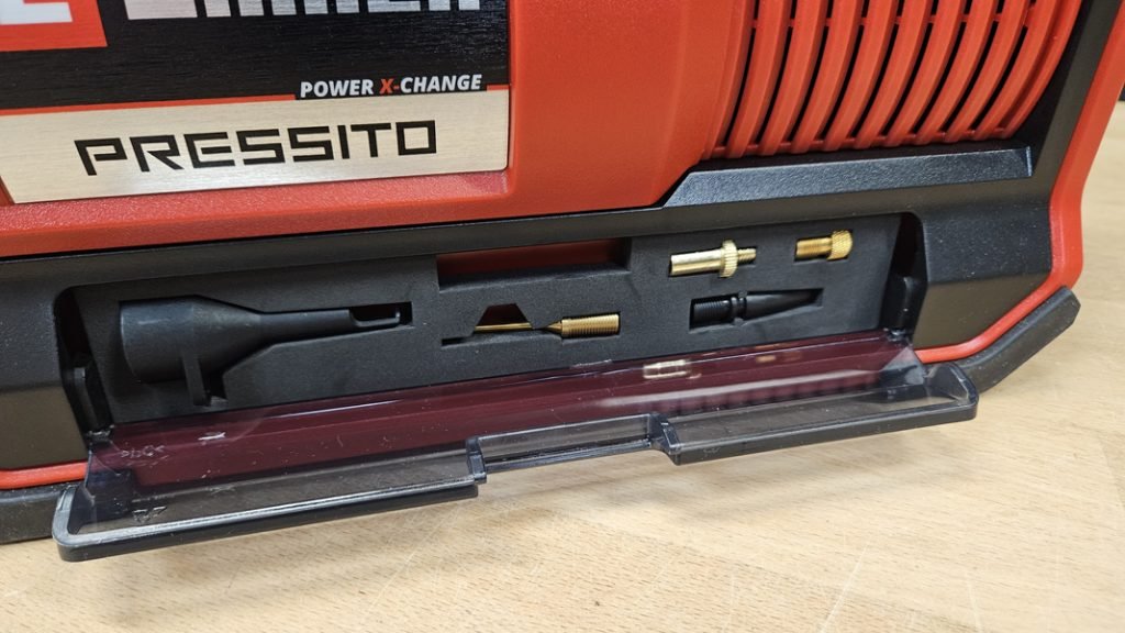 Le Pressito 18/25 Hybrid est livré avec plusieurs embouts adaptés aux différentes valves : pneus vélo ou auto, ballons, bouées, etc. Un compartiment fermé sous le boîtier permet de les conserver à portée de main.
