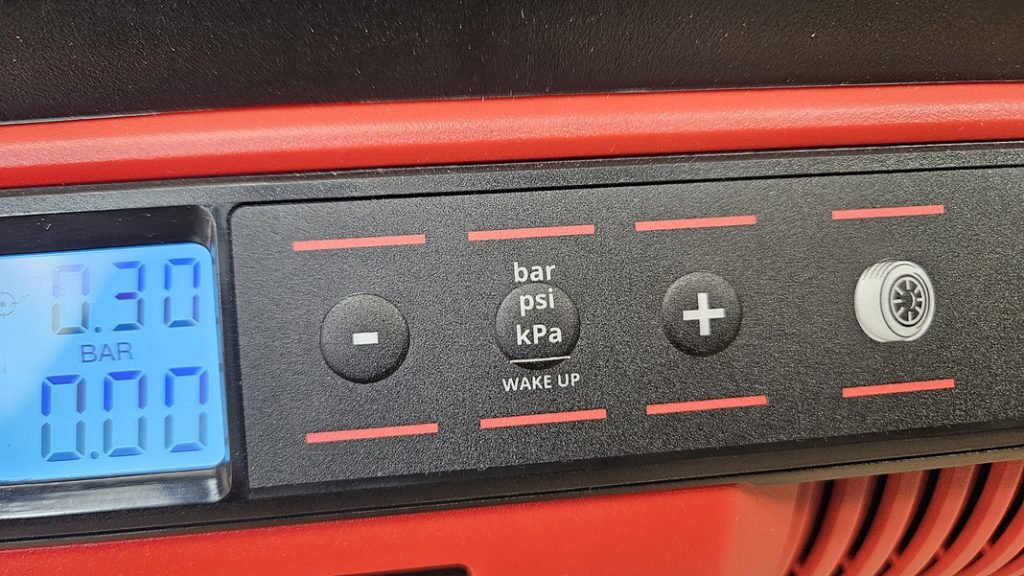 Le mode automatique permet de définir une pression cible. Une fois atteinte, le compresseur s’arrête de lui-même. Une petite lampe est également intégrée, utile en cas d’intervention dans l’obscurité.