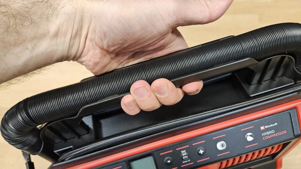 Avec un poids de 2,52 kg sans batterie, ce n’est pas l’appareil le plus léger, mais sa poignée large et sa conception compacte facilitent le transport. Tous les accessoires (tuyaux, embouts, adaptateurs) sont intégrés au boîtier dans des logements prévus à cet effet. Plus besoin de sac ou de boîte séparée : tout reste bien rangé, prêt à l’emploi. Les tuyaux (gonflage, dégonflage) se clipsent facilement et sont de bonne longueur pour un usage confortable.