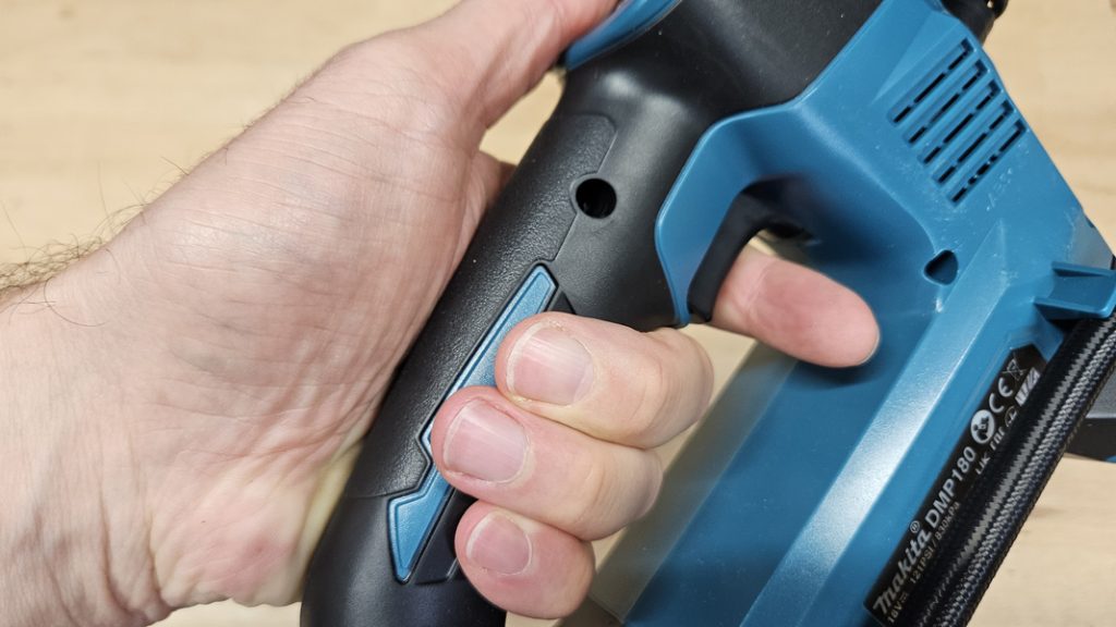 Le Makita DMP180Z dispose d’un panneau de commande simple et intuitif. Vous pouvez choisir l’unité de mesure (bar, PSI ou kPa) puis définir la pression souhaitée avec les boutons + et –. Une fois la valeur réglée, il suffit de maintenir la gâchette pour lancer le gonflage. Le système s’arrête automatiquement lorsque la pression cible est atteinte. Dommage toutefois que le gonflage automatique (sans maintenir la gâchette) ne soit pas disponible, cela aurait apporté un confort supplémentaire.