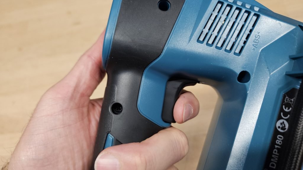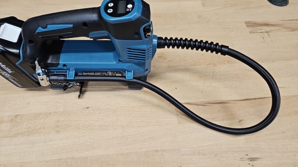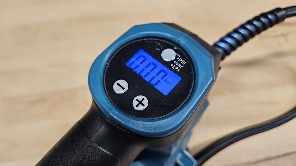 Le Makita DMP180Z dispose d’un panneau de commande simple et intuitif. Vous pouvez choisir l’unité de mesure (bar, PSI ou kPa) puis définir la pression souhaitée avec les boutons + et –. Une fois la valeur réglée, il suffit de maintenir la gâchette pour lancer le gonflage. Le système s’arrête automatiquement lorsque la pression cible est atteinte. Dommage toutefois que le gonflage automatique (sans maintenir la gâchette) ne soit pas disponible, cela aurait apporté un confort supplémentaire.