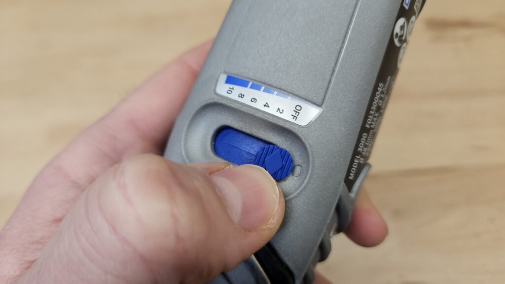 Avec un poids de 550 g, le Dremel 3000 demeure relativement légère, toutefois, en utilisation prolongée ou en prise en mode stylo, la section du carter peut générer une légère fatigue. La compacité générale reste satisfaisante pour les accès restreints, mais pour des travaux très fins ou répétitifs, l’ajout d’un flexible améliore nettement l’ergonomie et la précision du geste. Sans cet accessoire, la machine reste exploitable, mais moins confortable pour les travaux détaillés.
