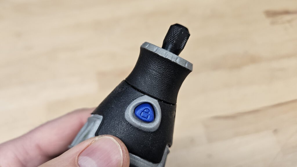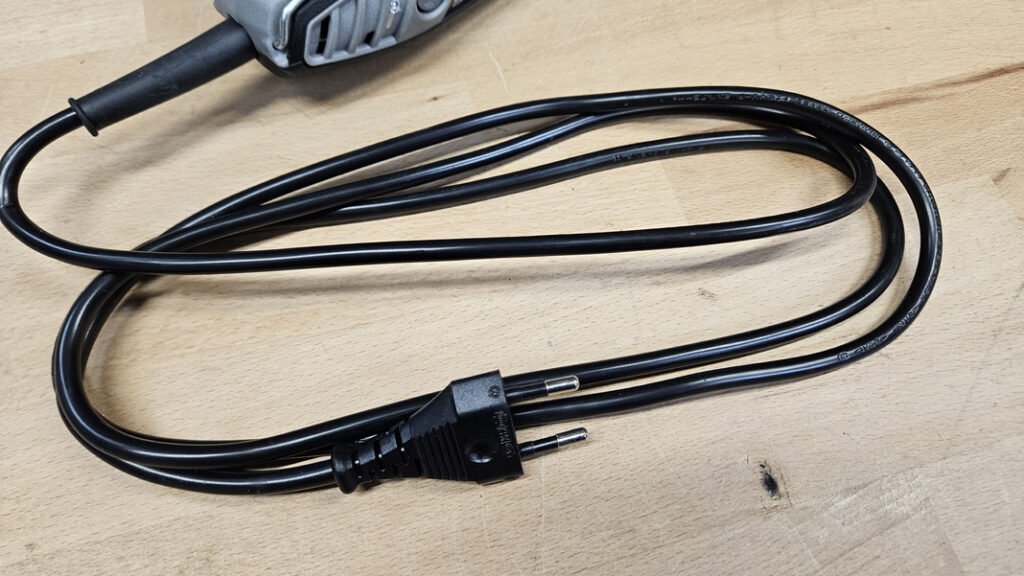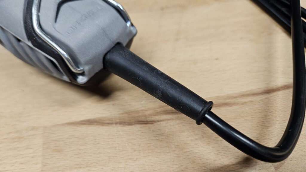 Le Dremel 3000 se branche sur secteur avec un câble d’alimentation de 2 mètres. Cela permet de bénéficier d’une alimentation constante sans variation de puissance liée à une batterie. En contrepartie, la mobilité reste dépendante de la proximité d’une prise. Un point intéressant concerne le renfort situé à la base du câble. Cette zone est souvent sujette à l’usure prématurée sur les outils filaires. Ici, le renfort limite les contraintes mécaniques répétées et améliore la durabilité de l’ensemble.