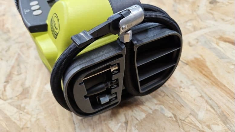 Le R18I se distingue aussi par sa compacité et sa stabilité. Il peut être posé au sol pendant toute l’opération, ce qui évite toute fatigue inutile. Tous les embouts sont fournis, y compris une aiguille pour ballon et un embout à levier pour valve auto. Leur rangement intégré autour de la machine est un vrai plus en mobilité.