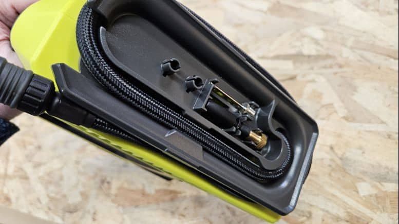 Tous les accessoires (aiguille pour ballon, buse pour matelas, adaptateur) sont également intégrés dans des logements spécifiques, ce qui évite de les perdre. Un vrai gain de temps et de praticité, en particulier en déplacement.