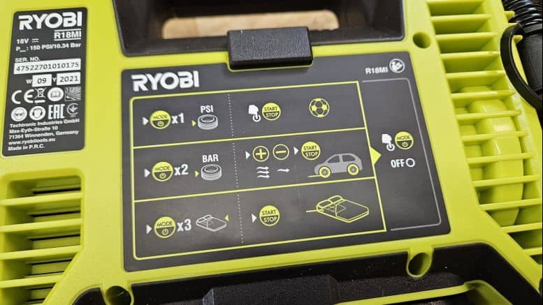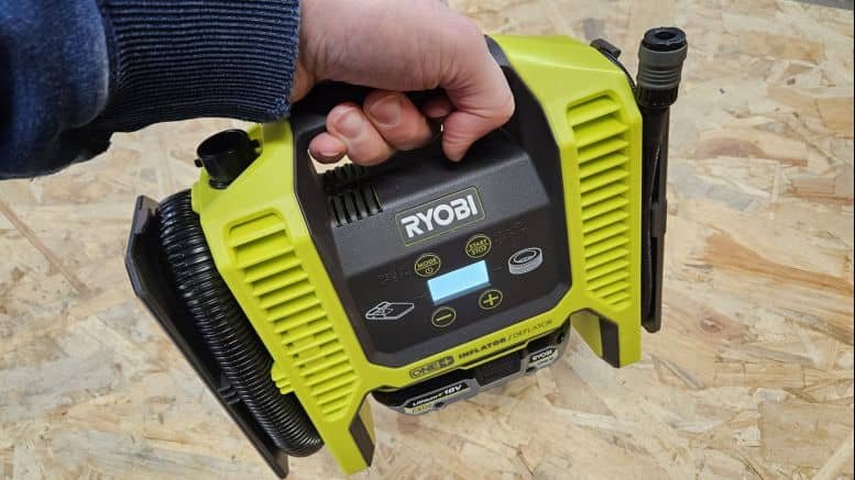 Côté performances, le Ryobi R18MI monte jusqu’à 10,3 bars, ce qui permet de gonfler facilement n’importe quel type de pneu, qu’il s’agisse de voiture, de vélo ou de moto. Son débit d’air en mode gonflage volumineux atteint 500 litres par minute, soit plus du double du modèle précédent R18I. Il peut ainsi remplir un matelas double en moins de deux minutes.