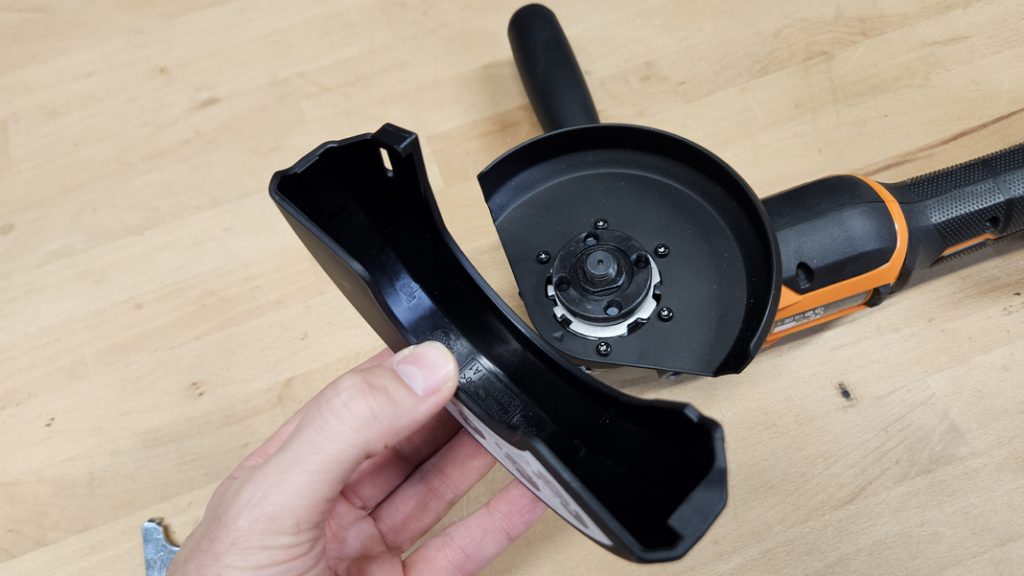 Le carter de protection se verrouille grâce à un levier rapide qui permet de l’orienter facilement et de le bloquer fermement pour éviter tout déplacement pendant la coupe. La marque a de plus ajouter une protection supplémentaire, afin d’offrir une plus grande sécurité, même si je vous recommande toujours de porter les protections adaptées. Ce duo de protections se montre pratique afin d’adapter la protection en fonction de l’orientation de travail.