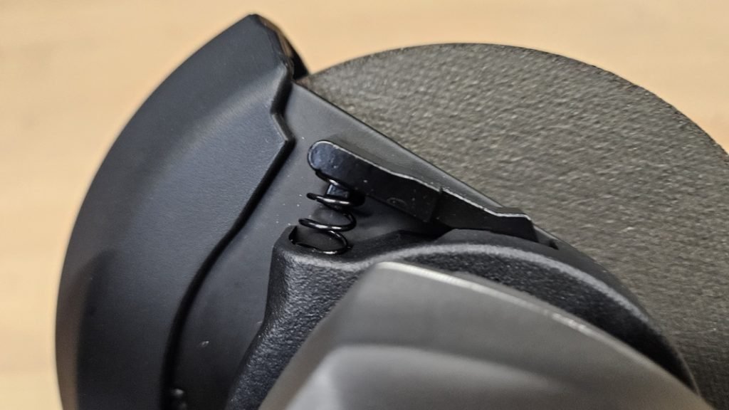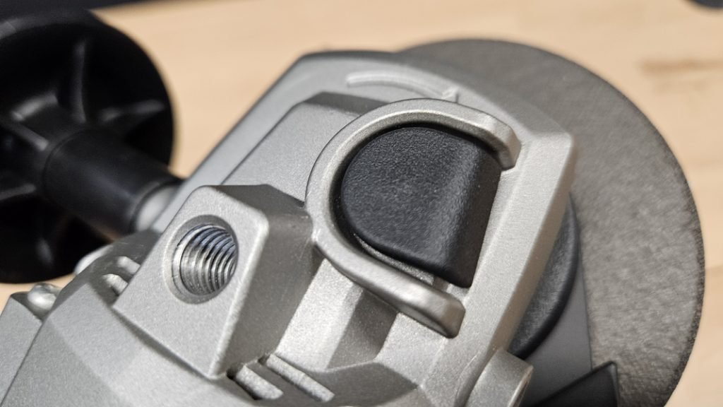 Le carter de protection se verrouille grâce à un levier rapide qui permet de l’orienter facilement et de le bloquer fermement pour éviter tout déplacement pendant la coupe. La marque a de plus ajouter une protection supplémentaire, afin d’offrir une plus grande sécurité, même si je vous recommande toujours de porter les protections adaptées. Ce duo de protections se montre pratique afin d’adapter la protection en fonction de l’orientation de travail.