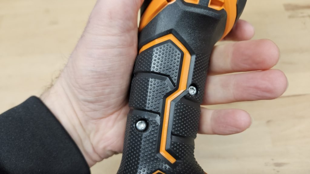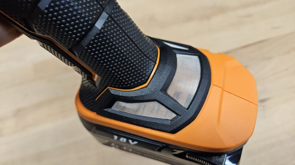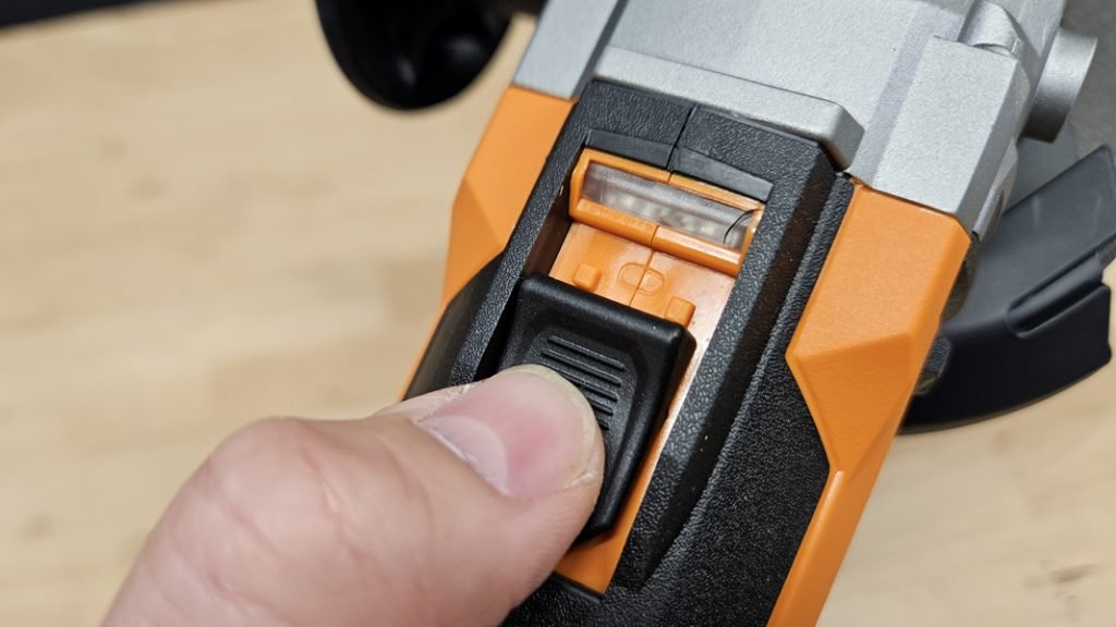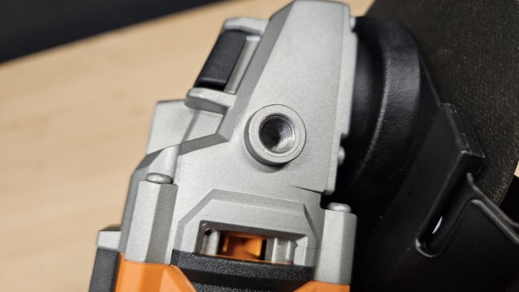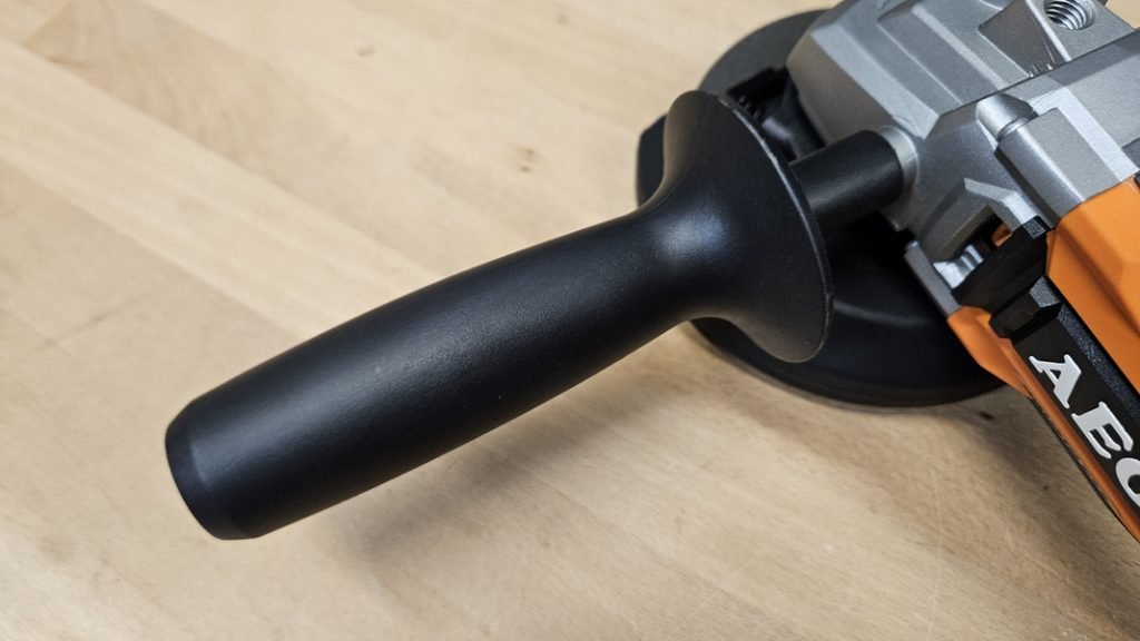 Avec un poids de 2 kg sans batterie, cette meuleuse reste maniable pour un outil de sa catégorie. Le manche principal est recouvert d’un revêtement antidérapant confortable, garantissant une bonne accroche. Le moteur démarre en douceur et s’arrête rapidement lorsque la gâchette est relâchée, pour plus de sécurité. Une poignée secondaire peut être fixée sur trois positions, ce qui facilite la prise en main en fonction du type de coupe ou de l’angle de travail choisi. L’équilibre global est bon, même avec une grosse batterie.