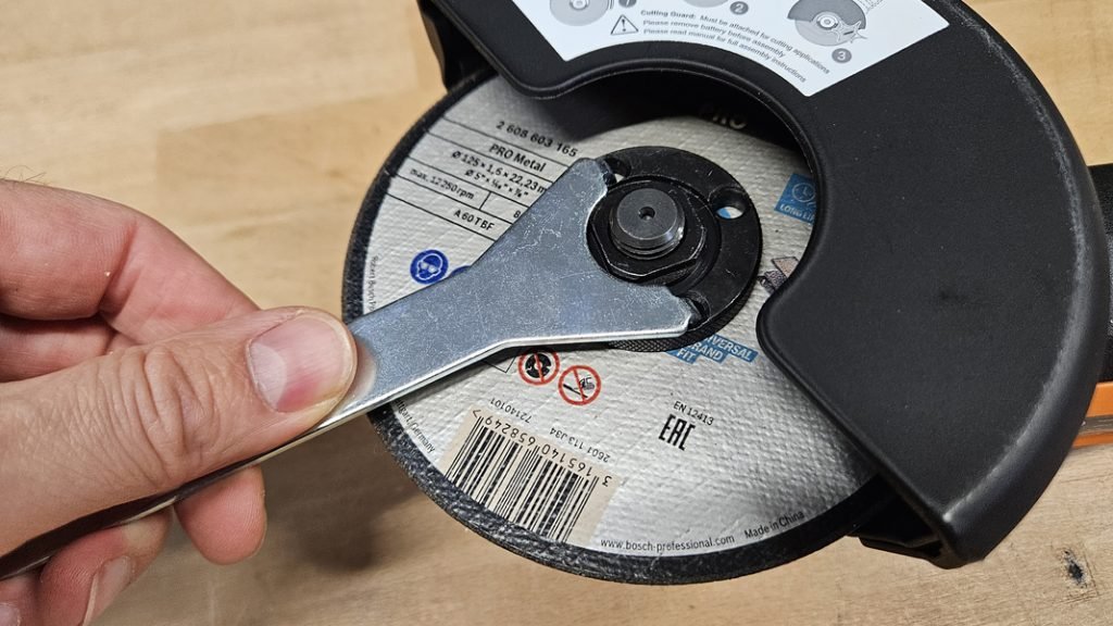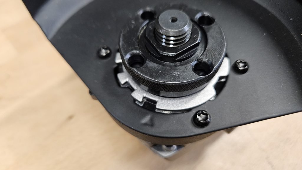 On retrouve un système assez classique, à savoir un bouton de blocage de l’arbre, qui facilite le changement de disque avec la clé fournie.