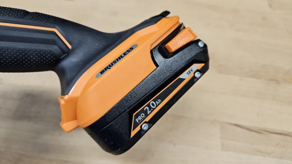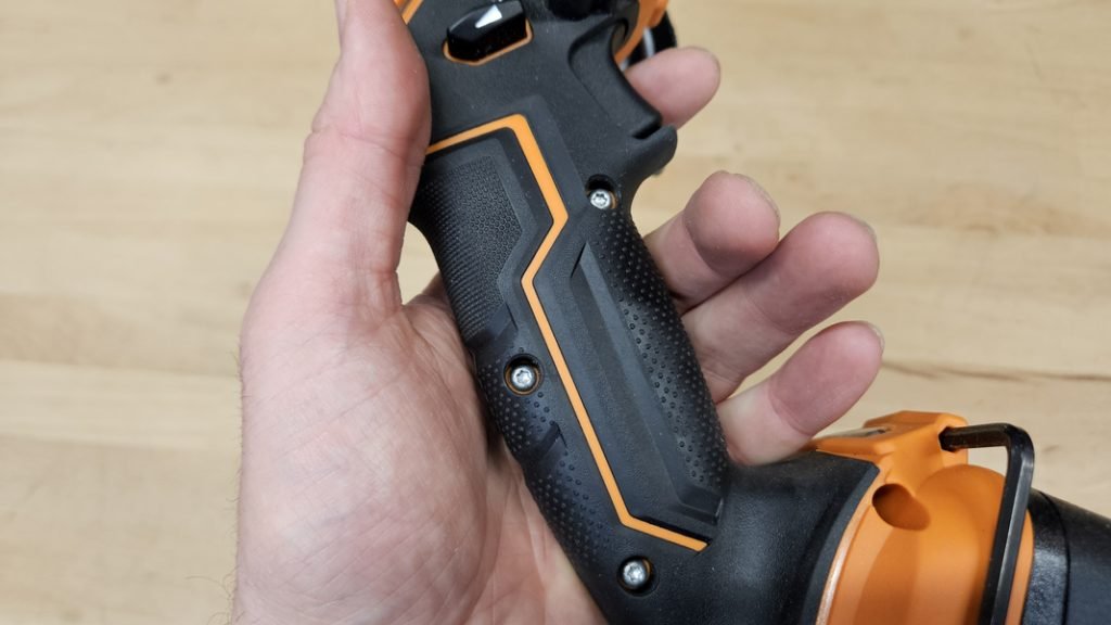 Les commandes sont intuitivement placées à portée de doigts : une gâchette ergonomique pour déclencher facilement le moteur, ainsi qu’un bouton de sécurité permettant de bloquer l’outil pour éviter tout démarrage accidentel. Le frein moteur intégré renforce la sécurité en stoppant rapidement le disque dès que l’on relâche la gâchette.