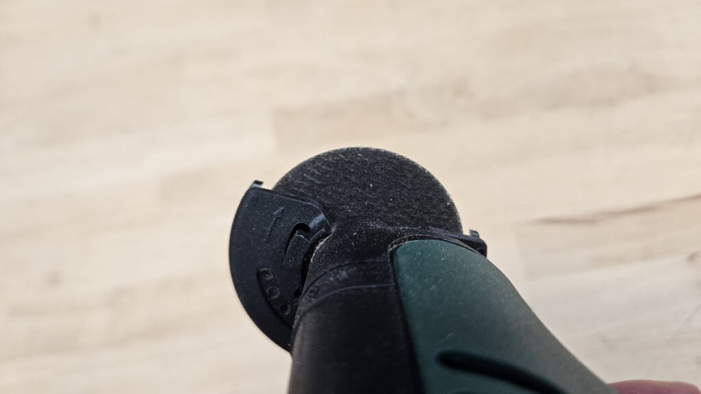 Côté sécurité, Bosch a intégré une commande à double action, il faut pousser un levier vers l’avant, puis actionner le bouton pour déclencher. Cette logique réduit les risques de démarrage involontaire pendant le transport ou lors d’une prise en main rapide. La protection est de plus assurée par un carter orientable, qui permet de protéger l’utilisateur des projections.