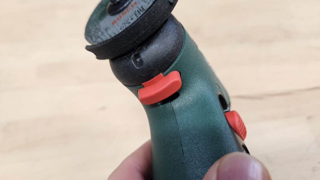La motorisation est à charbon, ce qui est cohérent pour une machine compacte et de faible tension. Pour ce qui est des performances, elles sont forcément inférieures à une meuleuse 18V. Bosch annonce malgré tout une vitesse de rotation de 6200 tr/min. Ce qui veut dire que sur des matériaux fins, cette vitesse permet de travailler correctement, à condition d’adapter le disque et de respecter les limites d’épaisseur. Lors des essais, la coupe d’une planche de médium se fait de manière relativement nette, avec un bon contrôle de trajectoire. Le revers est la poussière générée, surtout sur le bois et les panneaux, ce qui impose un minimum de protection et un environnement adapté.