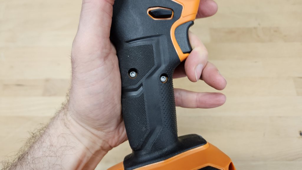Les poignées ergonomiques, recouvertes d’un grip confortable et antidérapant, permettent un contrôle précis et une réduction de la fatigue, notamment lors des coupes prolongées. Un bouton de sécurité intuitif placé sous le pouce assure une utilisation sécurisée, évitant ainsi tout démarrage accidentel.