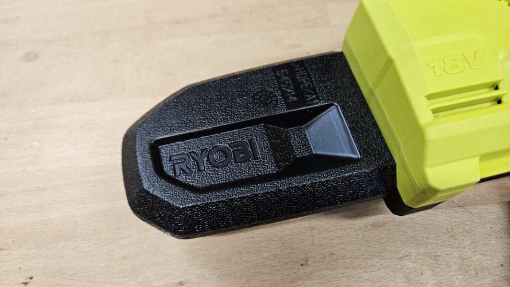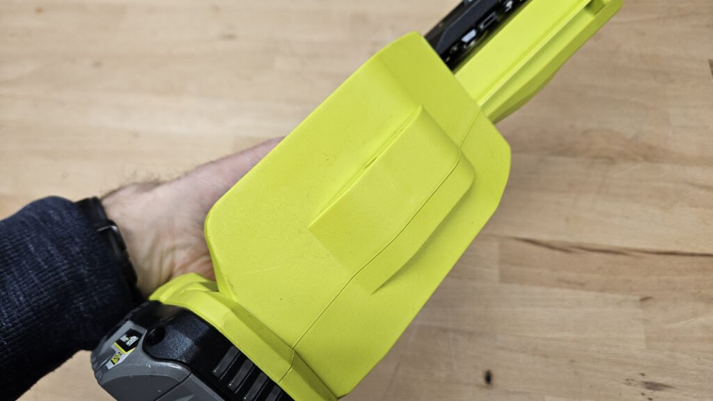 Cette mini tronçonneuse Ryobi vise à rendre l’élagage et les petites coupes plus simples, plus sûres et moins fatigantes. Son gabarit réduit facilite les interventions dans les massifs ou dans les arbres, là où une tronçonneuse classique devient vite encombrante. Dès la prise en main, on constate l’équilibre de l’outil, la poignée est bien dessinée, le revêtement offre une bonne accroche même avec des gants, et les commandes tombent naturellement sous les doigts. La machine reste nerveuse sans être brutale, ce qui aide à contrôler le trait de coupe et à travailler proprement sur des branches de différents diamètres.