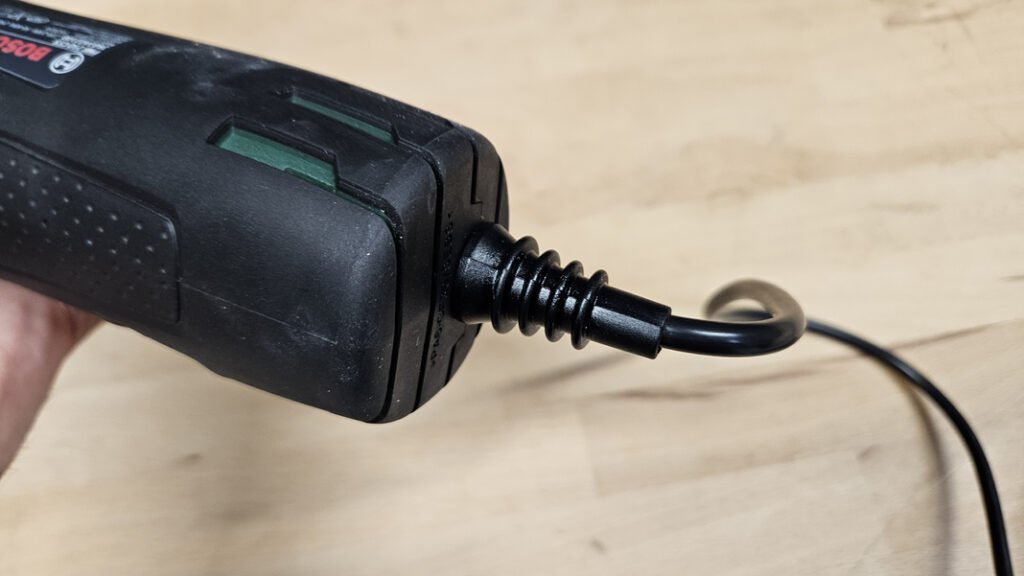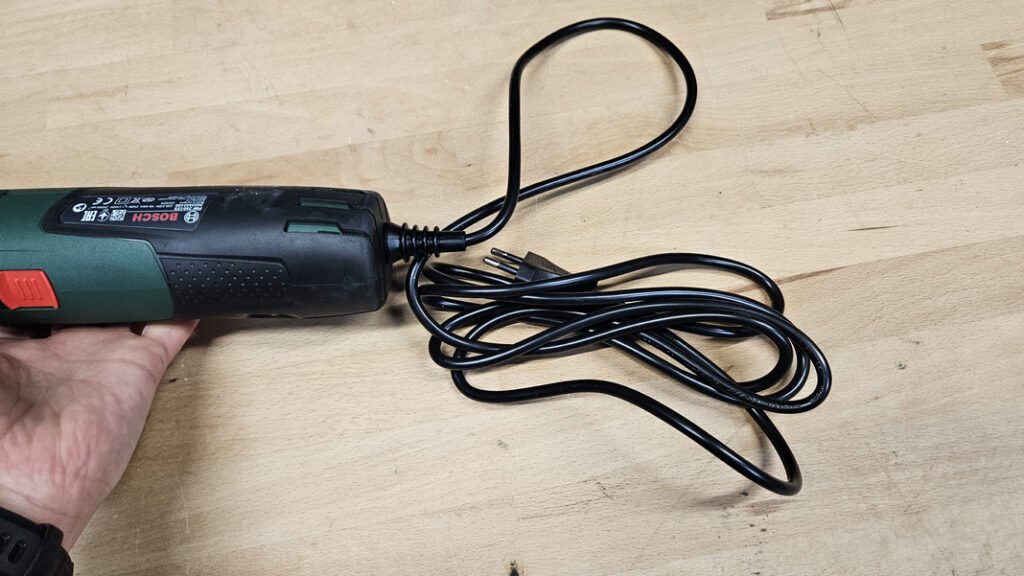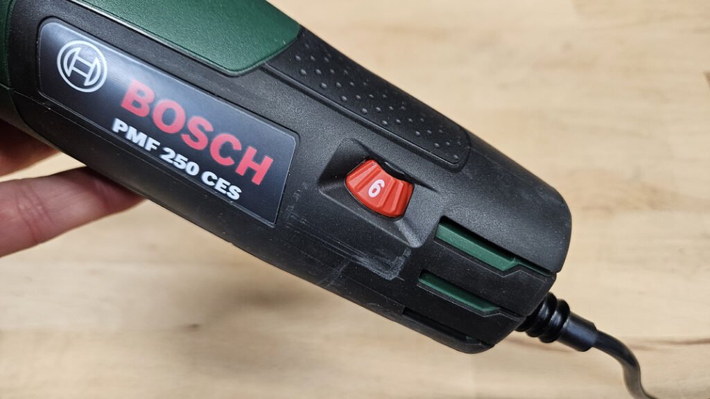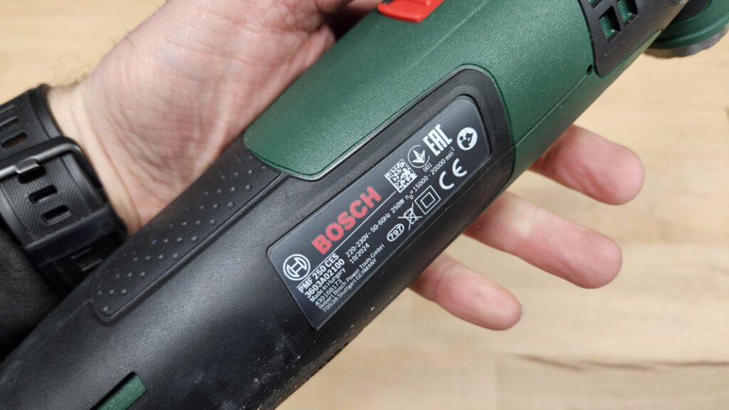 Le Bosch PMF 250 CES fonctionne sur alimentation filaire, avec un câble de 2,5 m offrant une bonne liberté de mouvement autour du poste de travail. Ce choix garantit une puissance constante sans contrainte d’autonomie. Le point de sortie du câble est de plus renforcé, un détail appréciable pour limiter l’usure sur cette zone souvent sollicitée.