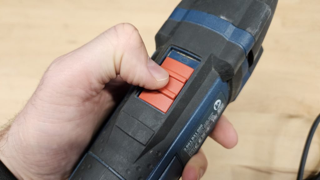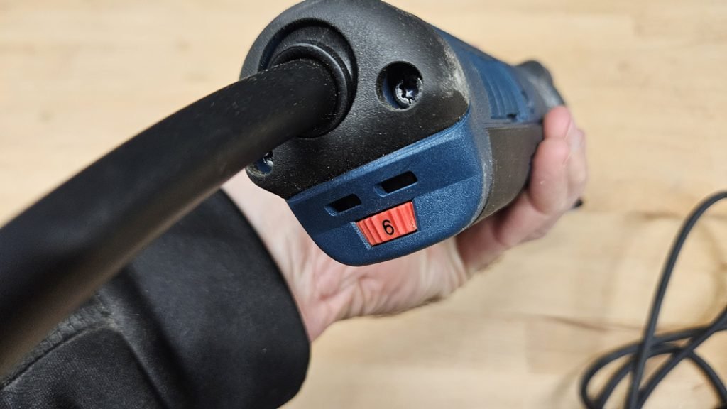 Le GOP 40-30 dispose d’un variateur à la base de la poignée, offrant une plage de 8000 à 20000 oscillations par minute. Cette amplitude permet d’adapter la vitesse à chaque tâche : vitesses réduites pour le ponçage ou les découpes délicates, vitesse maximale pour les coupes franches. L’amplitude d’oscillation est de 1,5° de chaque côté, soit 3° au total, une valeur standard qui garantit une découpe efficace et rapide.