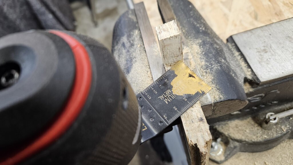 Côté chiffres, on est sur une plage de 11 000 à 20 000 oscillations/min via un variateur 6 positions, et surtout une amplitude annoncée à 3,2°. C’est un point clé, puisque plus l’amplitude est élevée, plus l’outil “mange” efficacement la matière (à lame identique). À l’usage, on sent clairement que la machine a du répondant : sur le bois, les découpes sont rapides, et sur le métal (clou), on peut travailler proprement sans martyriser le support.