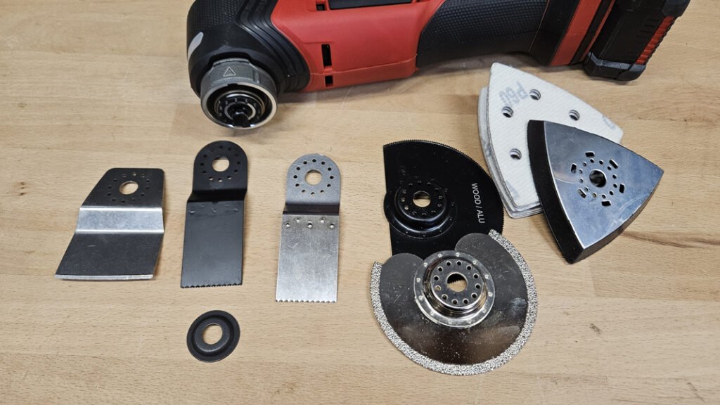 Ce modèle est souvent vendu nu (sans batterie ni chargeur), mais le pack d’accessoires reste plutôt complet. On retrouve notamment des lames bois, des lames pour bois/métal, une lame pour des usages plus spécifiques (type carrelage selon les versions), un racloir pratique pour enlever colle ou résidus, ainsi qu’un plateau de ponçage triangulaire pour utiliser des abrasifs adaptés. C’est un bon point : vous pouvez réellement commencer à travailler dès l’ouverture de la boîte, sans devoir acheter immédiatement un lot d’accessoires.