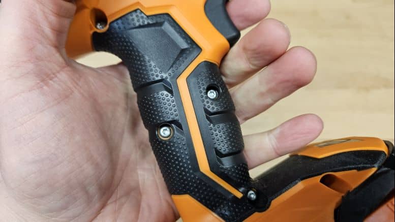 La prise en main est encore améliorée par la poignée secondaire fournie, que j’ai utilisée lors des perçages plus intenses. Elle se fixe solidement sur le boîtier et peut être placée à gauche ou à droite.