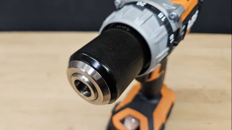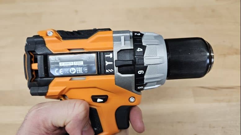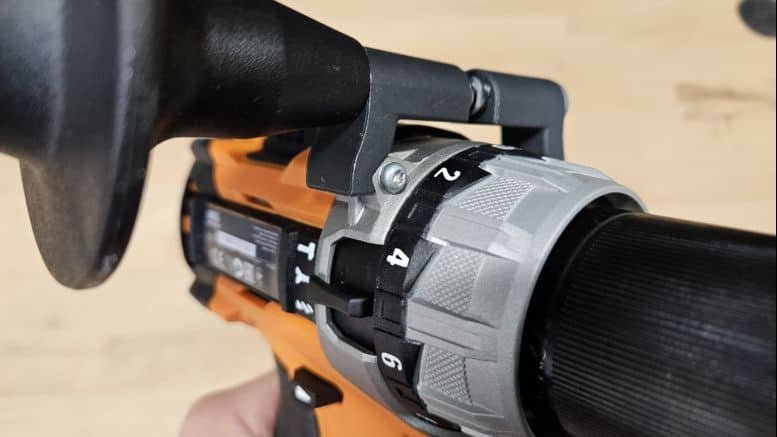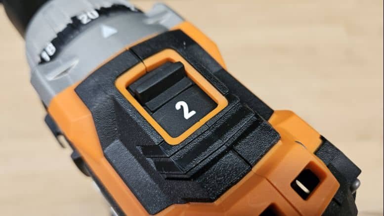 La perceuse propose 20 positions de réglages afin d’adapter le couple selon le matériau et la taille de vis. On accède ensuite au mode perçage (couple maximal) et enfin au mode percussion. Le changement de vitesse se fait par un interrupteur sur le dessus, entre les deux vitesses mécaniques disponibles.
