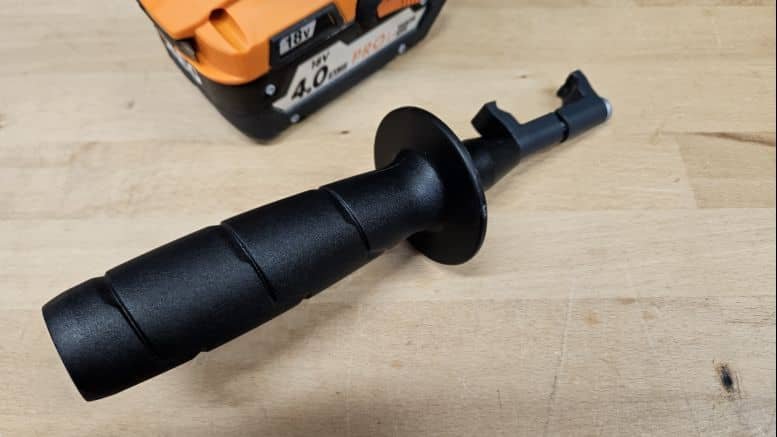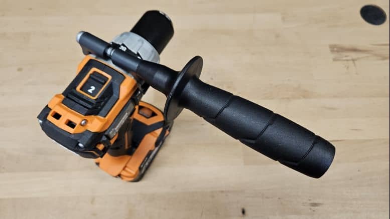La prise en main est encore améliorée par la poignée secondaire fournie, que j’ai utilisée lors des perçages plus intenses. Elle se fixe solidement sur le boîtier et peut être placée à gauche ou à droite.