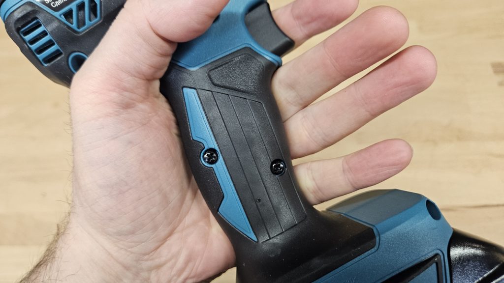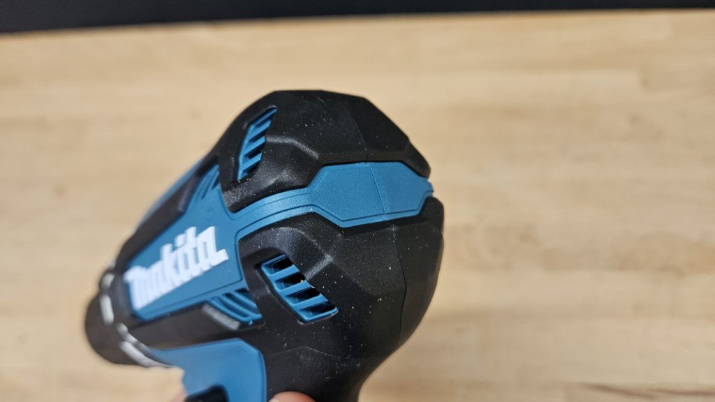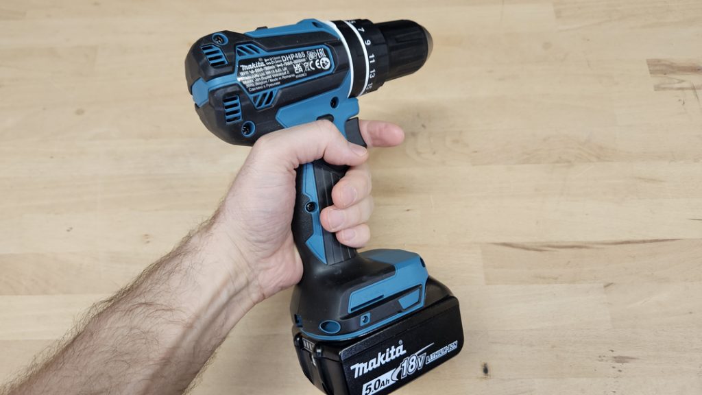 Avec un poids de 1,14 kg (hors batterie), la DHP485Z reste relativement légère pour une perceuse à percussion. Elle est bien équilibrée, surtout avec une batterie 3Ah. Le grip caoutchouté est présent sur l’ensemble de la poignée et offre un bon confort. Les commandes sont bien placées : inverseur de sens, gâchette réactive, tout est fluide. Vous pourrez apprécier aussi les renforts en gomme qui protègent le carter en cas de chute.