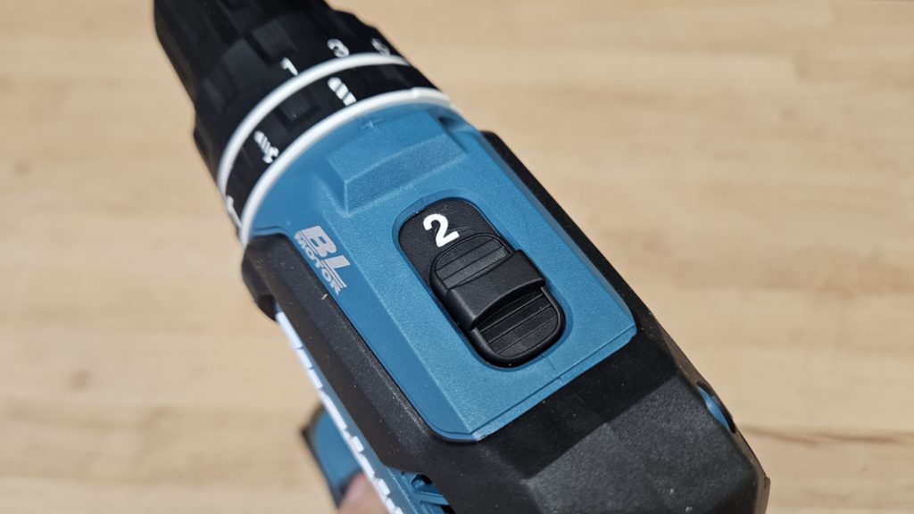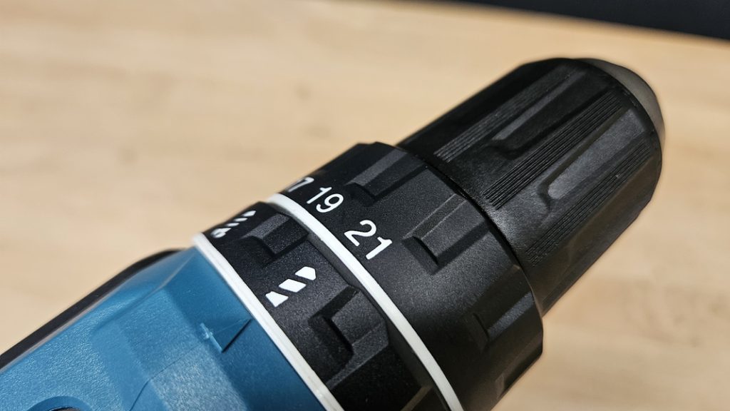 La perceuse dispose de deux vitesses mécaniques : 500 tr/min en vitesse lente, et jusqu’à 1900 tr/min en vitesse rapide. Une première bague permet de plus de régler le couple de serrage, et une seconde bague permet de choisir entre les modes vissage, perçage simple ou percussion.