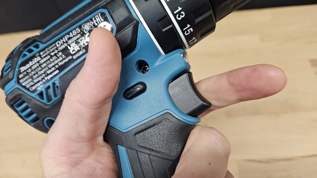 Avec un poids de 1,14 kg (hors batterie), la DHP485Z reste relativement légère pour une perceuse à percussion. Elle est bien équilibrée, surtout avec une batterie 3Ah. Le grip caoutchouté est présent sur l’ensemble de la poignée et offre un bon confort. Les commandes sont bien placées : inverseur de sens, gâchette réactive, tout est fluide. Vous pourrez apprécier aussi les renforts en gomme qui protègent le carter en cas de chute.