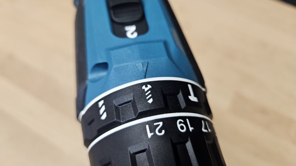 La perceuse dispose de deux vitesses mécaniques : 500 tr/min en vitesse lente, et jusqu’à 1900 tr/min en vitesse rapide. Une première bague permet de plus de régler le couple de serrage, et une seconde bague permet de choisir entre les modes vissage, perçage simple ou percussion.