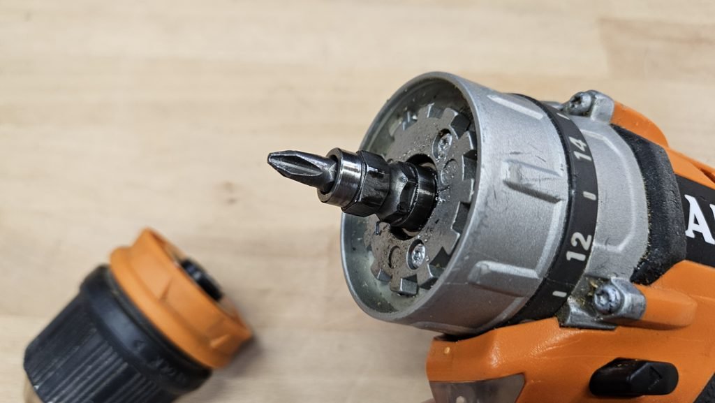 L’un des grands atouts de cette perceuse AEG, c’est son mandrin auto-serrant amovible. Une fois retiré, on accède à un porte-embout intégré, parfait pour gagner en compacité ou visser dans des zones difficiles d’accès.