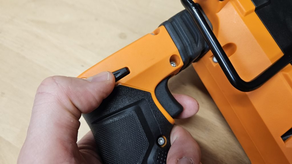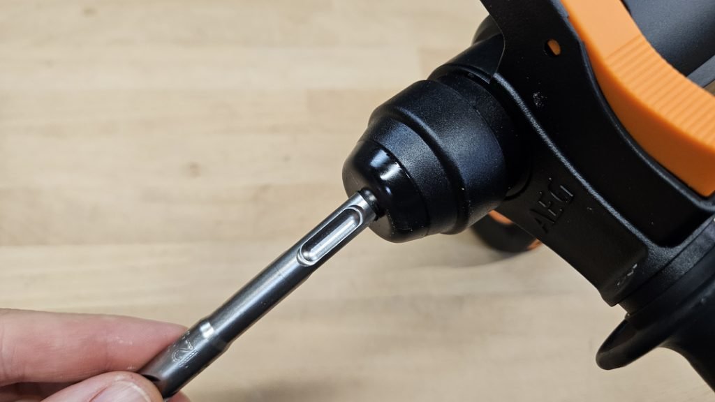 Le mandrin SDS+ permet une insertion rapide et sûre des mèches. Le retrait des mèches est tout aussi simple grâce au système de bague facile à manipuler. De plus, ce modèle est équipé d’un crochet métallique réglable, pratique pour accrocher le perforateur durant les pauses sur un escabeau par exemple.