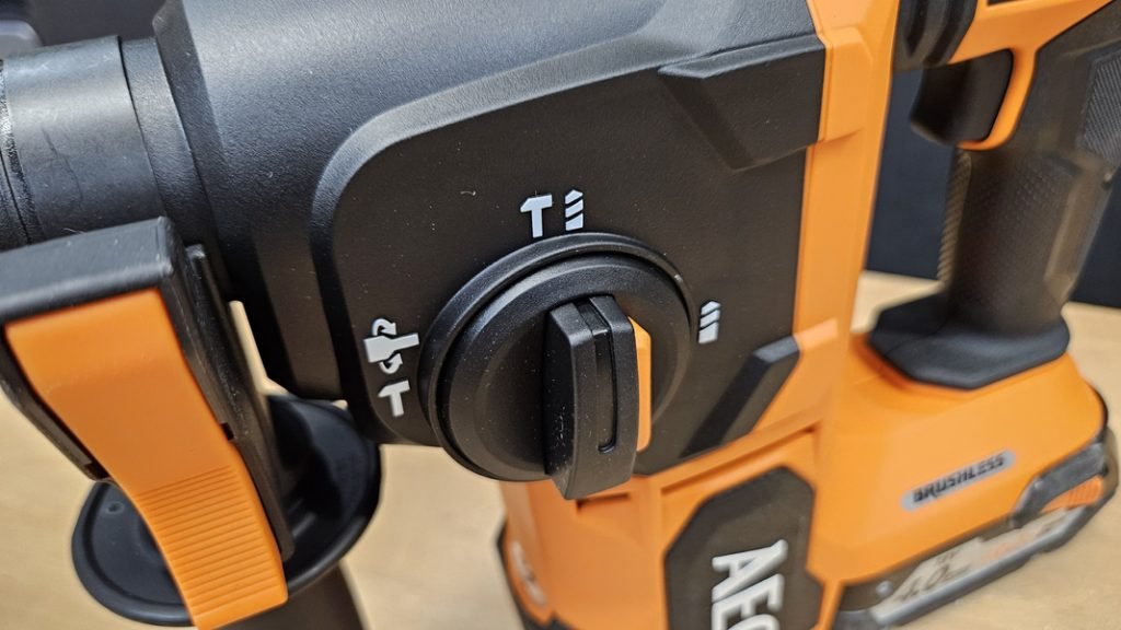Le perforateur AEG BBH18BL2 propose différents modes clairement indiqués : perçage simple, perçage avec percussion, et burinage sans rotation. Il dispose également d’une position supplémentaire permettant d’orienter précisément le burin pour des tâches spécifiques, comme l’enlèvement précis de matériaux tels que le carrelage.