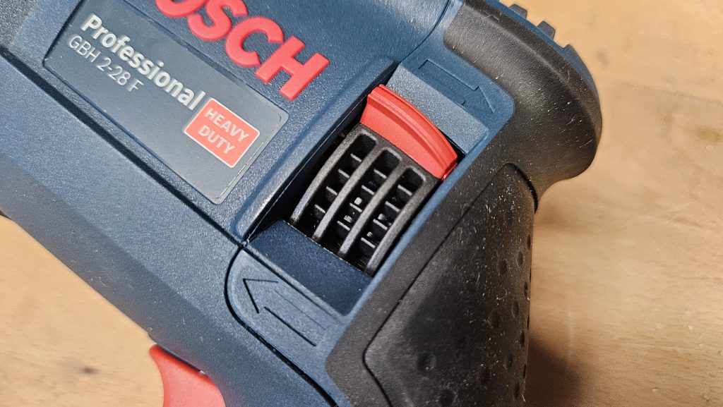 Le Bosch GBH 2-28 F propose quatre positions clairement identifiées : le perçage simple sans percussion, le perçage avec percussion, le mode burinage sans rotation, ainsi qu’une position supplémentaire permettant d’orienter précisément le burin selon les besoins spécifiques du travail, notamment pour retirer du carrelage ou réaliser des travaux précis.