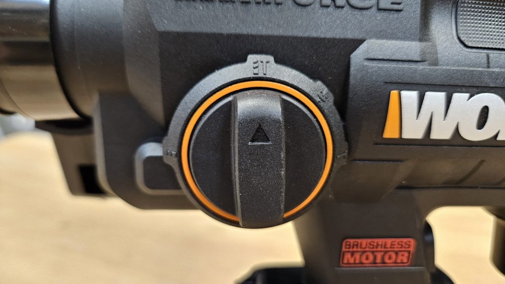 Le WX381.9 propose trois principaux modes d’utilisation clairement identifiés : perçage simple, perçage avec percussion et burinage sans rotation. Une quatrième position permet l’orientation précise du mandrin pour ajuster l’angle du burin, ce qui est particulièrement utile pour des tâches précises comme la dépose de carrelage.