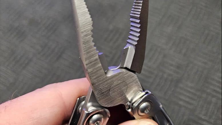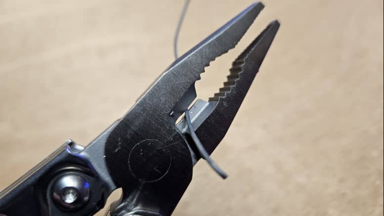 - Une zone coupante, capable de couper sans peine des fils ou petits câbles, mais non remplaçable (contrairement à certains modèles plus haut de gamme).