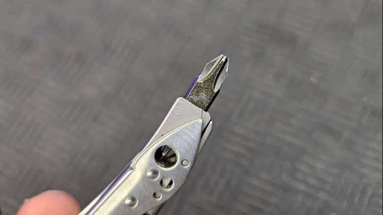 L’autre fonctionnalité clé du Skeletool, c’est son porte-embout. Fournie avec un embout double (PH2 / plat), elle permet de visser et dévisser facilement.