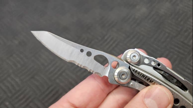 La lame principale du Skeletool est accessible sans ouvrir l’outil. Longue de 6,5 cm, elle est partiellement dentelée, ce qui la rend efficace sur une grande variété de matériaux, y compris le cordage.